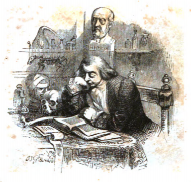 In this image. Gulliver sits reading at a table. This appears during the first chapter where Gulliver introduces himself. The image represents Gulliver studying to become a surgeon, so that he could join a ship. Several busts, a skull, and the skeleton of a small animal are visible on the shelves behind Gulliver, along with various medicine bottles. The same image appears in the 1843 Krabbe edition.