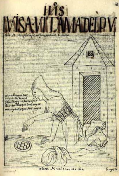 This image depicts a disabled Andean woman who cannot walk, kneeling in front of a house on the ground as she does chores. She is reaching to what appears to be a plate of food and there is a cloth bag to her left. The author explains that the disabled people of Spanish colonial Peru suffered much mistreatment and ostracization from priests, nobles, and lords. The woman has dialogue written by her face which reads, ninallayqui diosrayco, cristiano yacullayqui diosrayco, llamtallayqui diosrayco, micuyllayqui diosrayco [your fire, christian, is for God, your water, christian, is for God, your wood is for God and your food is for God].