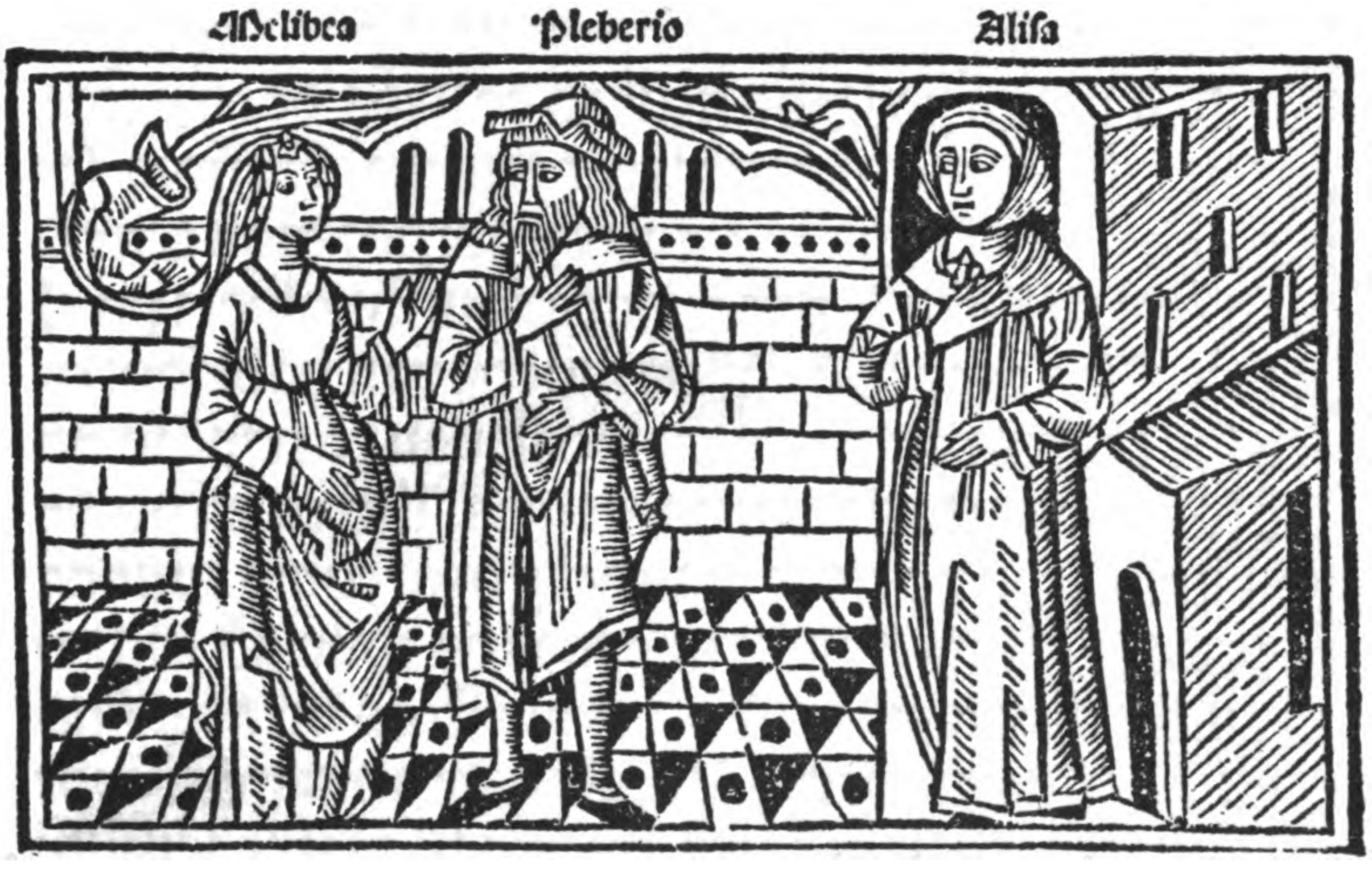 In this image we see Melibea talking to her father Pleberio, whose hand is placed over his heart. This is presumably the scene in which they are taking a walk, after Lucrecia tells him of the illness that has affected Melibea's heart (Melibea has not yet revealed that this illness is one of sorrow, caused by the death of Calisto). Alisa is also present, to the right of the image. This is somewhat odd, seeing as she is said to stay in bed when Pleberio goes to check on Melibea. Her presence here, with her hand placed over her heart, may simply be intended to convey the pain she feels upon hearing that Melibea is ill.