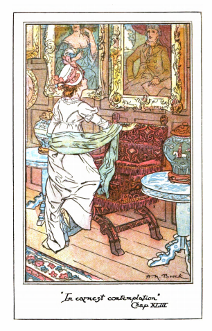 Here we see Elizabeth touring Mr. Darcy’s estate, Pemberley. She visited his estate in the north of England while on vacation with her aunt and uncle. They went on a tour with Mr. Darcy’s housekeeper, Mrs. Reynolds. In this image, she admires some of the portraits in Pemberley. She particularly admires the portraits of Mr. Darcy and Mr. Wickham. In this image, Elizabeth kneels on a chair to get a closer look at the portrait of Mr. Darcy. There are vases on either side of the couch. This scene occurs in chapter 43 as noted underneath the title of this image. Elizabeth wears the regency style dress with an empire waist. Her hair is worn tied up, as was tradition for women after their coming out before the queen, signaling her entrance into society. She wears a bonnet, a popular fashion of this period to protect her from the sun. Bonnets were especially popular because in this period a common pastime for women was going out on walks. Elizabeth has a shawl wrapped around her shoulders. The regency period dated to the early nineteenth century (1811-1820) when George, Prince of Wales, later George IV (r. 1820-1830), reigned as regent for his mentally ill father, King George III (r. 1760-1820). The regency period is associated with the rise of neoclassicism in art and fashion.