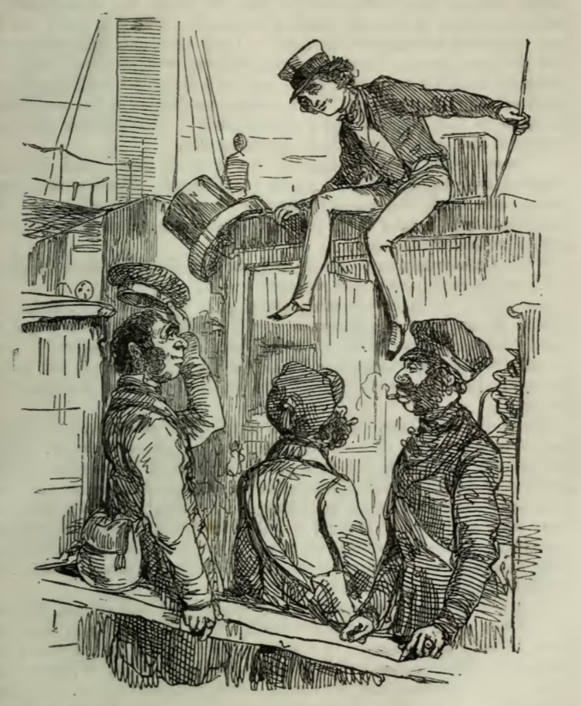 Georgy Osborne sits on top of his family’s carriage after climbing across the others, holding his hat in one hand. On the deck next to the railing below him are three workers; Mr. Kirsch, the courier, is lifting his hat in greeting to Georgy.