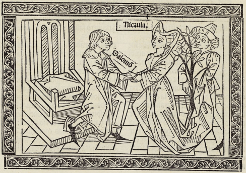 This engraving depicts Nicaula, the queen of Ethiopia, on the right-hand side of the engraving shaking hands with king Solomon of Jerusalem. We know that these figures are Nicaula and Solomon as their names are engraved beside their heads to identify them. Nicaula, as Boccaccio explains, was incredibly wise and wanted to hear and listen to the wisdom and intellect of Solomon. She had traveled from Ethiopia to Jerusalem to meet him. This engraving depicts their first meeting. Behind Nicaula is presumably one of her servants, who is carrying a balsam tree. The tree was one of many gifts that Nicaula had given to Solomon.