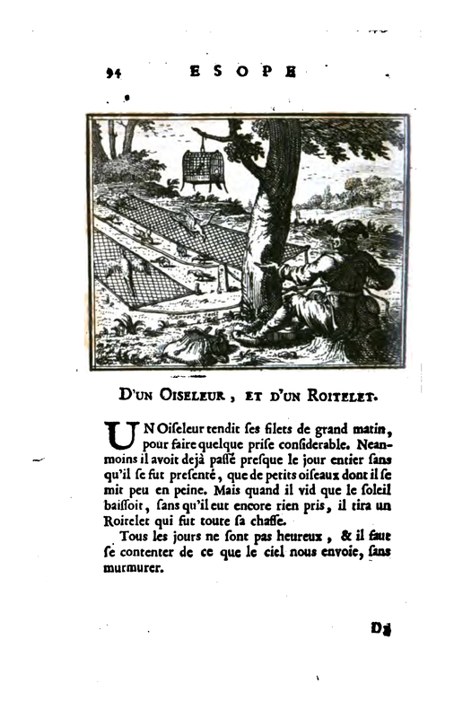 A bird catcher stretched his nets early in the morning, to make some considerable catch. Nevertheless, he had already spent almost the whole day without being present, only small birds of which made little noise. But when he saw that the sun was going down, without having taken anything yet, he drew a Wren which was all his hunt.