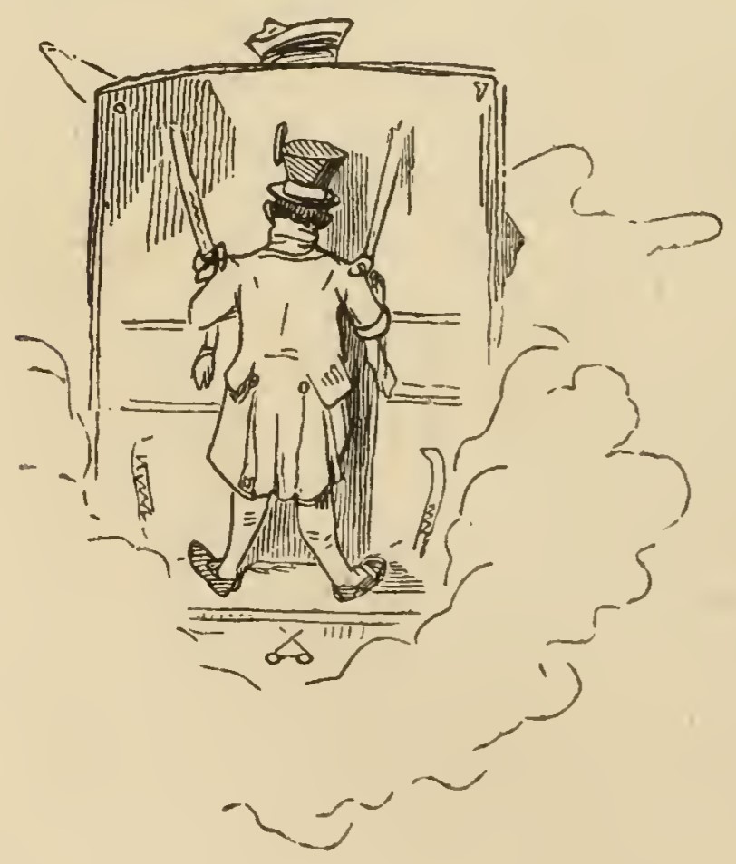 The image depicts the backside of a carriage, over the top of which the coachman’s hat can be seen. Sambo is standing on the base of the back of the carriage, holding on to two straps, as it drives away from Miss Pinkerton’s in a cloud of dust.