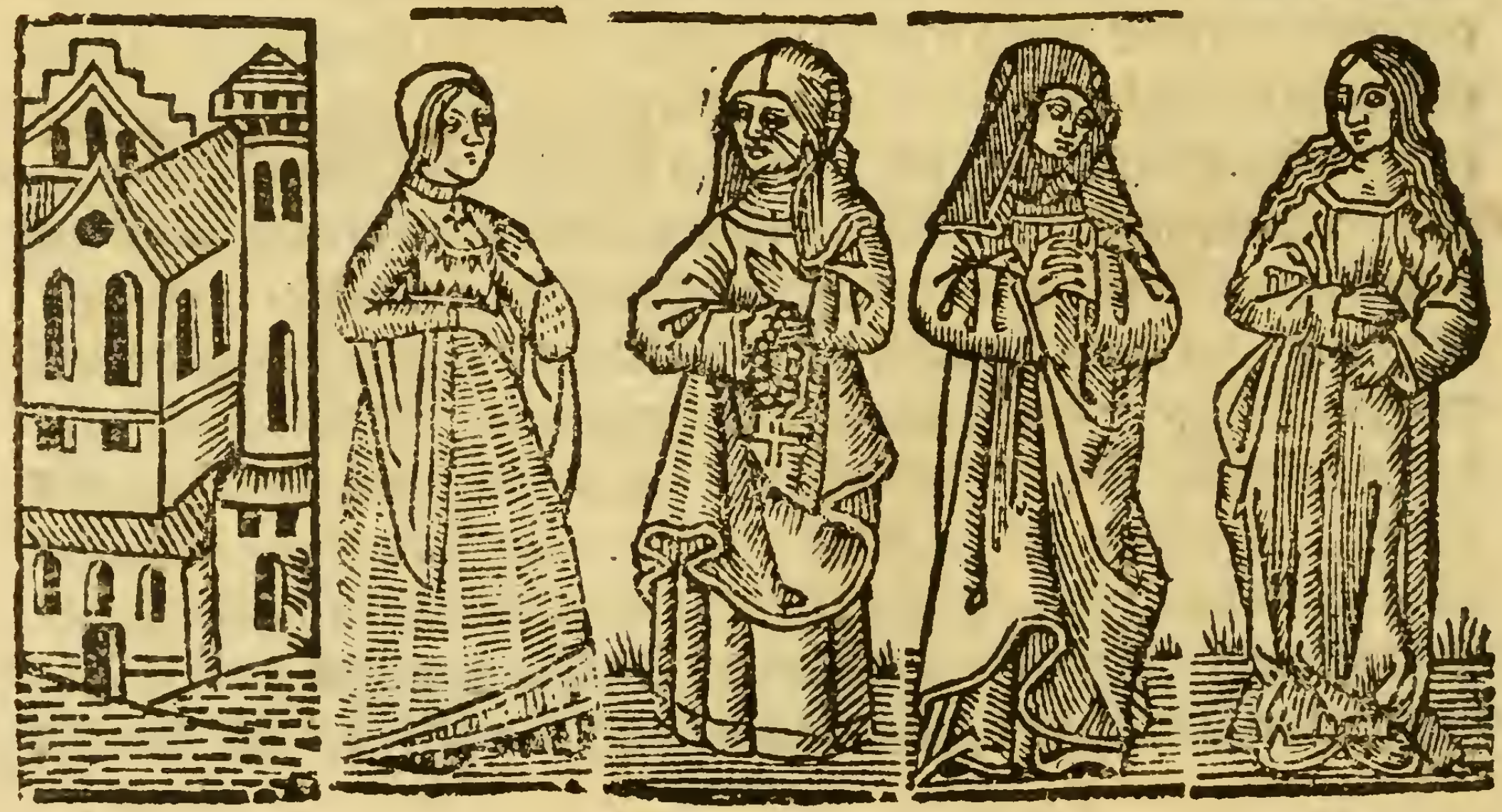 Celestina arrives at Melibea’s house, where she is greeted by Lucrecia, Melibea’s servant. As an old friend of Melibea’s mother Alisa, Celestina gains entry under the false pretense of paying her a visit and selling yarn. The servant of Alisa’s dying sister arrives and informs Alisa that her sister has requested her presence. Alisa departs, leaving Celestina alone with Melibea and Lucrecia. She talks for a while with Melibea and eventually reveals that she is there on behalf of Calisto, sending Melibea into a fit of rage. Celestina manages to quell her rage with a lie, telling her that Calisto’s cure requires only her girdle and a handwritten charm/spell. Melibea gives Celestina her girdle (as depicted in this illustration), and she asks Celestina to return the following morning to retrieve the charm.All four figures are depicted wearing robes. Additionally, the three leftmost figures are wearing veils, and the central left figure (presumably Celestina) has a rosary in her right hand.[The figures in this illustration are used in multiple other illustrations throughout this edition.]