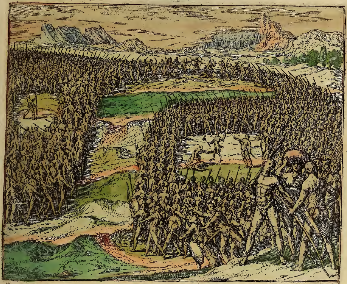 Two large groups of Indigenous people have massed in anticipation of war, with fighting breaking out at the far side of the groups. In a clearing at the center of the group on the right, a man holds up an idol – a figure with the head of a bird and talons for feet – that has been attached to the long pole held by the man (similar to a puppet). In front of the idol, a warrior kills another person while reaching out towards the idol. There is a gap in the center of the group on the left as well, where an individual holds a long pole. Most of the warriors are armed with spears, bows and arrows, clubs, and shields. This image is identical to one found on page 139 of Frankfurt, 1595, but colored.
