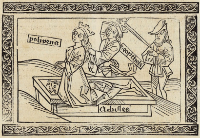 This engraving depicts Polyxena, the daughter of king Priam of Troy, getting executed on top of Achilles’ tomb. Polyxena is illustrated kneeling on the tomb of Achilles with her hands crossed while looking up to the sky as she accepts her fate. Her name is engraved beside her body to identify her. Achilles’ name is engraved on the side of his tomb. The man about to execute Polyxena is Neoptolemus, the son of Achilles. His name is engraved above his sword. Polyxena had lured Achilles into the temple of Apollo, where Paris shot Achilles with his arrow. Neoptolemus is the one to execute her as she is the one who is partly responsible for killing his father. She had done this through her mother’s instructions. Boccaccio explains that he wrote on Polyxena due to her fearlessness before her execution.