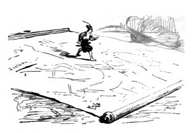 Here Gulliver stands on a map of Brobdingnag. This image appears at the end of chapter four, in which Gulliver describes the country of Brobdingnag, as he travelled throughout the country both with the farmer and the King and Queen.