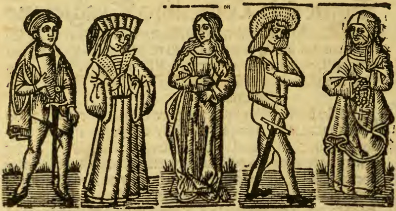 This image depicts multiple events in the first act. On the right, we see what is, presumably, the scene in which Sempronio visits Celestina to request her assistance on behalf of Calisto. To the left of this, the interaction between two figures is likely intended to represent the scene in which Calisto first encounters Melibea. The leftmost figure could be either Pármeno or Crito, although Pármeno’s relationship with Calisto, along with his greater importance in the narrative, signals that this is likely meant to represent Pármeno. Celestina is depicted wearing a robe and veil, with a rosary in her right hand. Melibea is wearing a robe. The three male figures are wearing hats, while Pármeno and Sempronio have swords.[The figures in this illustration are used in multiple other illustrations throughout this edition.]