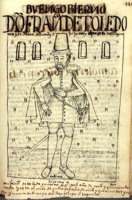 This chapter of the book focuses on discussing the good government of post-conquest Peru that the Spanish viceroys maintained. This image depicts a standing portrait of the fourth viceroy of Peru, Don Francisco de Toledo. He is depicted wearing traditional Spanish/European clothing. There is a caption at the bottom of the image which reads, Don Francisco de Toledo gouerno desde el año de mill y quinientos setenta hasta el mes de julio del año de mill y quinientos y ochenta y uno, en tienpo del rrey Felipo el segundo [Don Francisco de Toledo governed from the year 1570 to July 1581 in the time of King Philip II]. This viceroy is well-known for creating settlements for the indigenous peoples of Peru to congregate to in order to Christianize the land.
