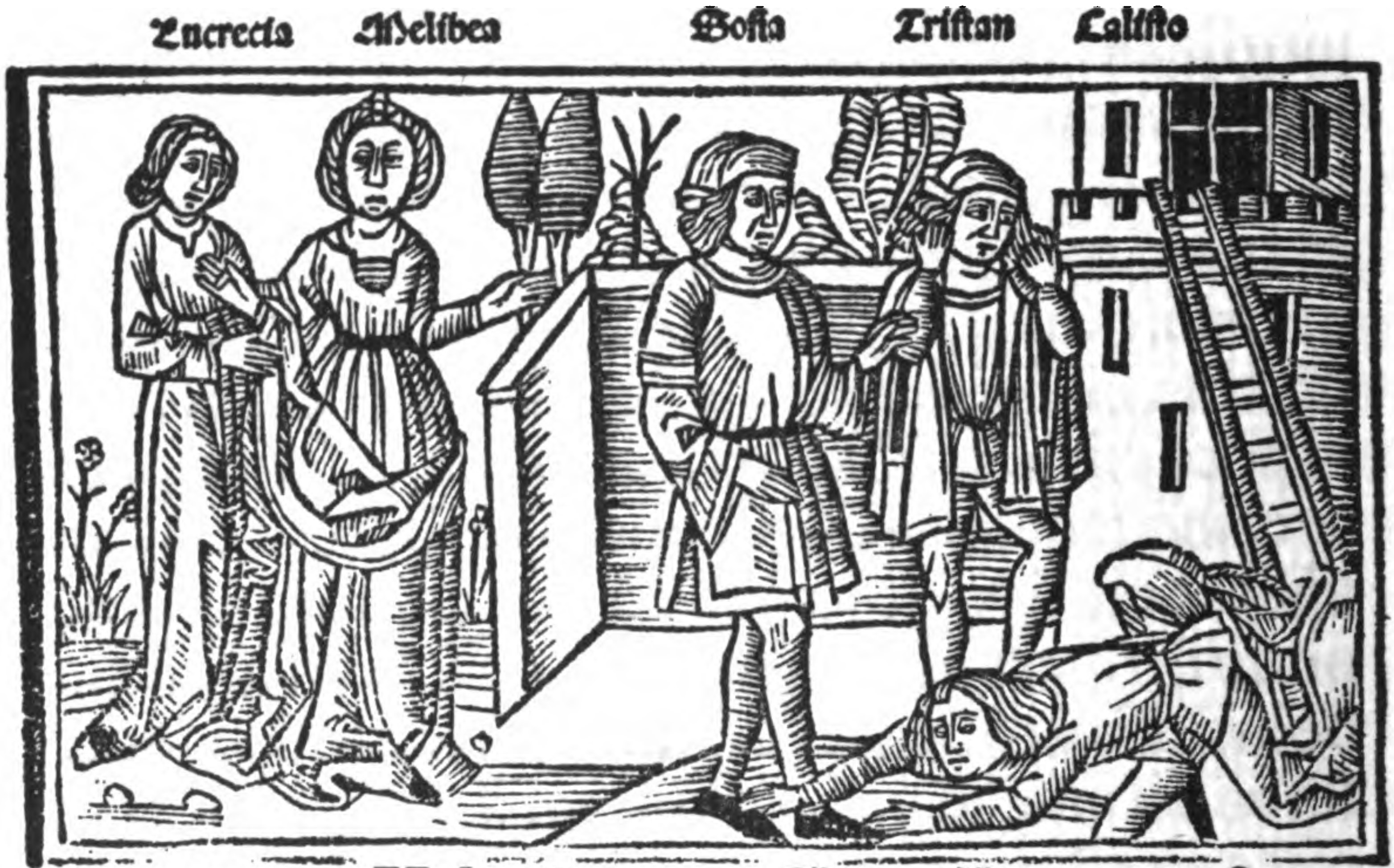 Calisto goes to spend another night with Melibea, and while there he seduces her. As he is leaving via the ladder used to scale the high garden walls (seen to the right, leaning against the tower in the background), he falls and is killed (on the ground in the bottom right corner).In this scene we see his servants Sosia and Tristán shocked by what has happened. To the left we also see Melibea, in despair at what she is witnessing, standing alongside Lucrecia who appears to be comforting her.