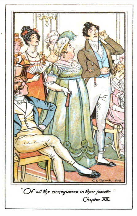 Here we see Viscountess Dowager Dalyrumple entering the Concert Hall in Bath with Mr. Elliot. Elizabeth Elliot is behind the Viscountess, arm in arm with her friend, Miss Cartaret. All the upper-class people in Bath attended this concert. This scene occurs in chapter 20 as noted underneath the title of this image. The characters are shown in the traditional regency style, with Elizabeth, the Viscountess, and Miss Cartaret wearing the regency style dress with an empire waist. Their hair is worn tied up, as was tradition for women after their coming out before the queen, signaling her entrance into society. Elizabeth and the Viscountess holds a fan, used in the regency era at balls, concerts, and other evening events both to provide relief from the often-hot ballroom or concert hall, but also to signal to others in the room. This language using fans was used most frequently when trying to communicate with a love interest, as it could be an invitation for the suitor to come over to a woman, indicate that they were being watched, among other things. Mr. Elliot wears a waistcoat and tailcoat with breeches and holds a monocle up to his eye. The regency period dated to the early nineteenth century (1811-1820) when George, Prince of Wales, later George IV (r. 1820-1830), reigned as regent for his mentally ill father, King George III (r. 1760-1820). The regency period is associated with the rise of neoclassicism in art and fashion.