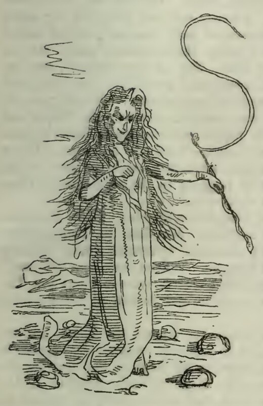 - A barefoot woman with loose, wild hair stands amongst scattered rocks. She holds a thin, tapered stick which is covered by a vine, the end of which curls up into the air to form the letter S from Such.