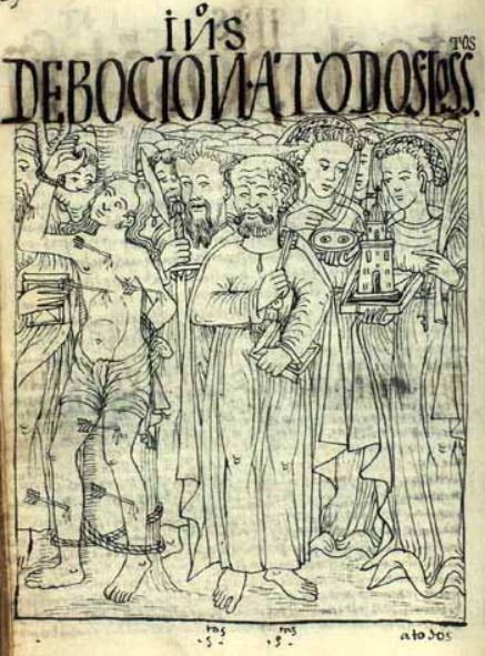 This image depicts many saints of the Christian church. In the centre of the image, Saint Peter is visible holding a book in his left arm and a key with his right hand. Saint Peter was often depicted holding keys in Christian iconography to symbolize the keys to Heaven. On Saint Peter’s right, there is a saint bound to a tree and has arrows sticking out from his body. This is Saint Sebastian, who was tied to a tree and shot with arrows during Roman emperor Diocletian’s persecution of Chrisitians. Saint Paul is depicted standing behind Saint Peter. He is illustrated holding a sword, as he was often depicted holding a sword and a book in Christian iconography. The woman standing behind Saint Peter’s left shoulder is Saint Lucia (also called Saint Lucy). She is depicted holding a plate with her eyes on it, as they were gouged out before her execution. Saint Barbara is the woman to Saint Peter’s left. She is illustrated holding a palm leaf in her left hand and a book with a tower on it in her right. She was executed for building a tower that had three windows to symbolize the Holy Trinity. The author included this image as he wanted to demonstrate that the indigenous commoners of colonial Peru were devout Christians.