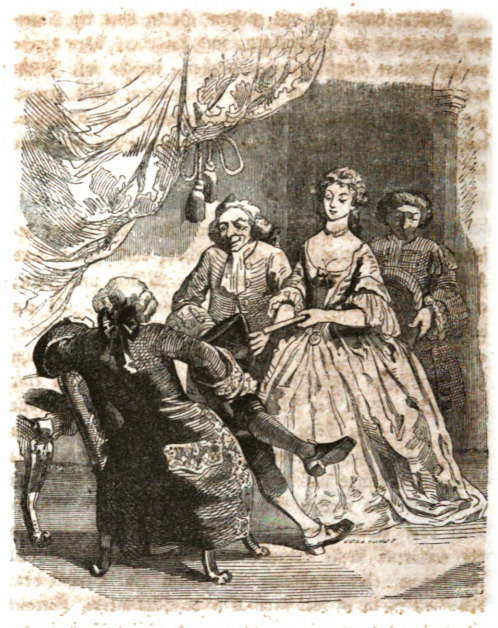 Here we see the Prime Minister of England surrounded by his wife and his ministers. At this point in the story, Gulliver explains various aspects of society and politics to his master and the other Houyhnhnms. Gulliver describes the corruption of the political system. Gulliver explains how someone becomes Prime Minister. The first way is through prudent deposition of any women his life, the second is by betraying or undermining his predecessor, the third is by his zeal in public assemblies opposing the corruption of the court. The same image appears in the 1843 Krabbe edition.