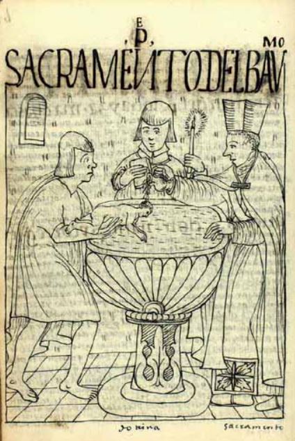 This image is illustrated in a chapter that discusses the Christian priests in the colonial government in Peru. This image depicts a priest on the right side of the image dressed in ecclesiastic adornments as he performs a baptism on an indigenous baby. A man on the left is illustrated holding the child as the priest pours the holy water over the head of the baby. The man in the centre is illustrated holding the Bible in his right hand and a candle in his left. The author explains that when a Christian native child receives the sacrament of baptism the people would hold great feasts and celebrations and offer gifts to the priests.