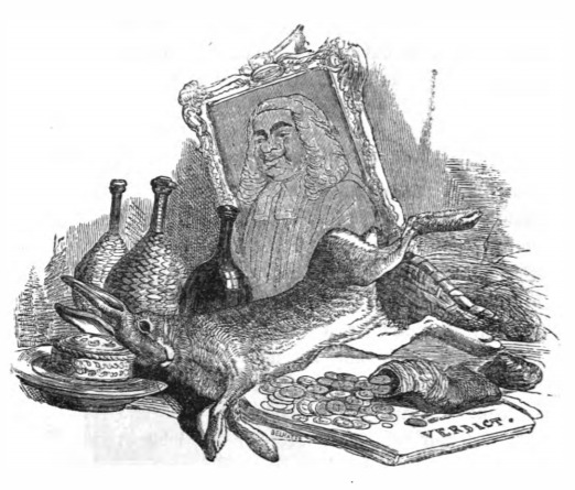 Here we see a depiction of the corruption of the English legal system. The image shows a desk with bribes on top of the verdict. A framed picture of a lawyer is in the back. We see a rabbit and several bottles, likely of expensive goods, and a coin purse with coins spilling out on top of a stack of papers, with the word verdict written on it. Gulliver tells the king about diplomacy, religion, the justice system, the arts, the financial system, and the nobility, then debated these issues with the king. This image comes when Gulliver is discussing the corrupt legal system, speaking to how the wealthy could buy their desired outcome. The same image appears in the 1839 Krabbe edition.