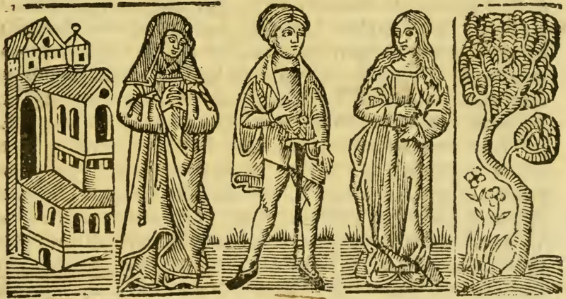 When Elicia arrives at Areusa’s house, she hears Areusa screaming and wailing. At first, she thinks that Areusa has already heard about the deaths of Celestina, Sempronio, and Pármeno, but she hears a second voice and realizes Areusa is having an argument with a man (presumably depicted by the two rightmost figures). Elicia waits outside (presumably depicted by the leftmost figure) until Centurio emerges from Areusa’s house, after which she enters. Areusa notices her sadness and asks its cause. She tells Areusa about the deaths, and they both blame the illicit love affair between Calisto and Melibea. Setting their sights on revenge, they decide to ask Centurio to kill Calisto. Elicia then returns home.[The figures in this illustration are used in multiple other illustrations throughout this edition.]