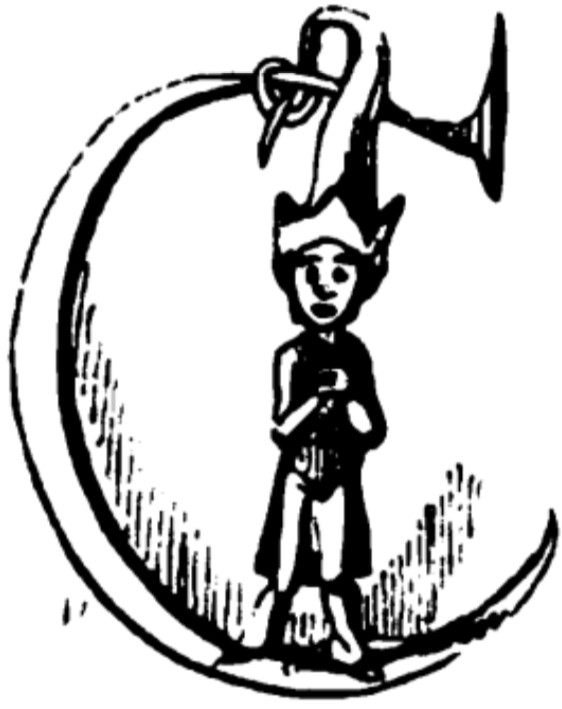 - A elf stands on the letter C from Considerable, with the end of his tall curling hat looped around its upper edge.