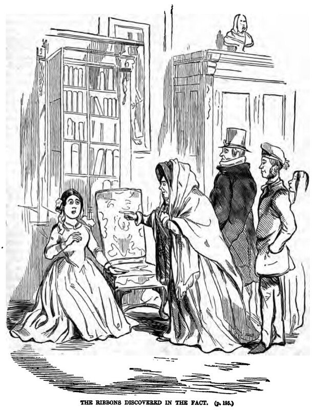 Miss Betsy Horrocks, with large ribbons in her hair, kneels in shock next to a chair in Sir Pitt Crawley’s study. Mrs. Martha Crawley, who has just caught Miss Horrocks trying a stolen set of keys on the locked drawers in the room, points an accusing finger at her. Behind her are Reverend Bute Crawley, her husband, and James Crawley, their son, who have both also witness the robbery. Below the illustration is printed its title and location in the story, THE RIBBONS DISCOVERED IN THE FACT. (p. 195.).