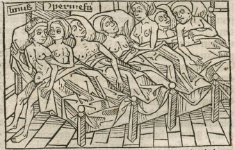 Hypermnestra and her husband, Linus, are illustrated on the edge of the bed on the left side of the engraving. We know these figures are Hypermnestra and Linus as their names are engraved above their heads. Hypermnestra is depicted with her arm lovingly touching Linus’ chest. As Boccaccio explains, a prophecy told Hypermnestra’s father that one of his nephews would kill him, so he married all his daughters to his nephews and instructed them to kill their new grooms to avoid this prophecy from happening. Hypermnestra, however, fell in love with her cousin Linus. Hypermnestra instructs him to leave to avoid her father and sisters from killing him. One of her sisters is depicted lying in the bed behind her, already having killed her husband, along with the other husbands that have been murdered.
