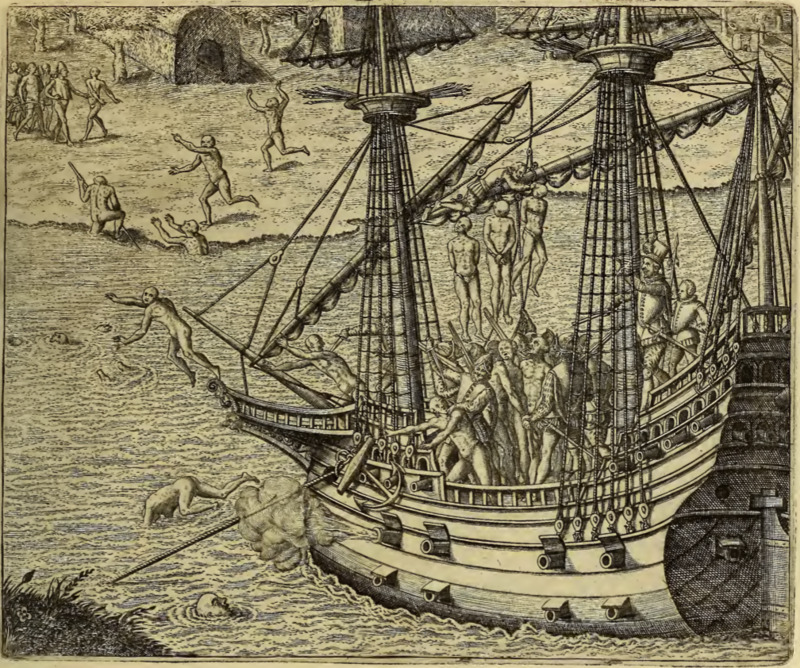 A large number of Indigenous people have been lured onto a Spanish ship by Diego d’Ocampo and his soldiers, in retaliation for an uprising against Spanish colonization in Venezuela. At least three Indigenous people have been hung from the mast of the ship. Several have escaped the ship by jumping overboard and swimming for shore, and some have reached the shore where they then flee the ship. The ship’s cannon is used to fire at those escaping. Two dwellings are visible near the shore.