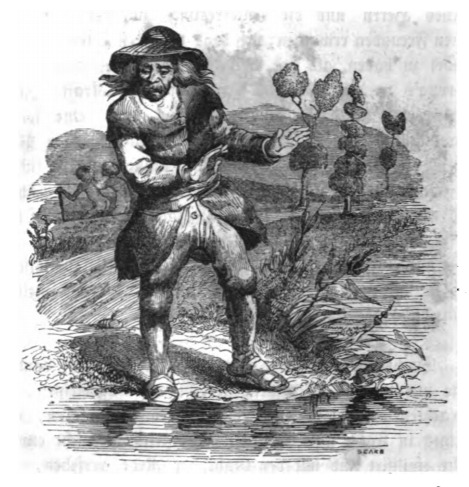 During his time on the Country of the Houyhnhnms, Gulliver began to hate all humans, because he viewed the Houyhnhnms to be superior beings, while the yahoos were inferior. It got to the point where Gulliver began to hate his own reflection because he looked like the yahoos. This sentiment stuck with Gulliver even after he returned home to England, and he could never look at a human the same way. The same image appears in the 1843 Krabbe edition.