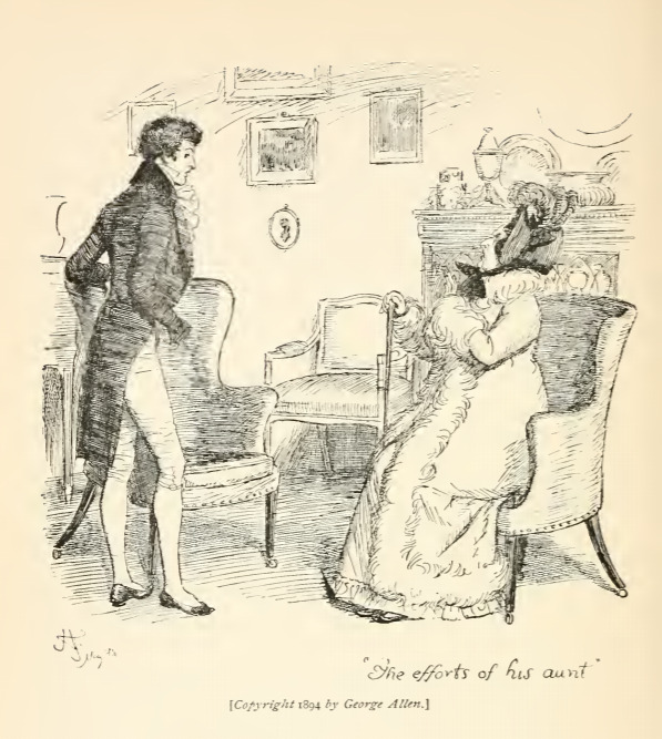In this image Mr. Darcy speaks with his aunt, Lady Catherine de Bourgh. Lady Catherine tried to persuade Mr. Darcy not to propose to Elizabeth. Lady Catherine wanted Mr. Darcy to marry her daughter, Mr. Darcy’s cousin. Lady Catherine planned the marriage between Miss de Bourgh and Mr. Darcy since their infancy. Mr. Darcy refused this engagement, firm in his conviction that he was going to marry Elizabeth. This scene occurs in chapter 58. The characters are shown in the traditional regency style. Lady Catherine wears a regency dress with an empire waist. She wears an overcoat and bonnet and holds a walking stick. Mr. Darcy wears a waistcoat and tailcoat with a cravat. The regency period dated to the early nineteenth century (1811-1820) when George, Prince of Wales, later George IV (r. 1820-1830), reigned as regent for his mentally ill father, King George III (r. 1760-1820). The regency period is associated with the rise of neoclassicism in art and fashion.