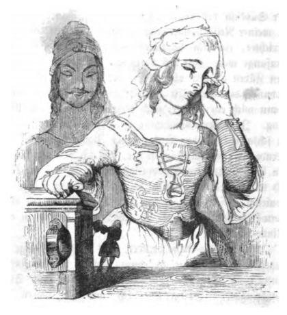 Gulliver and Glumdalclitch travel with the King and Queen of Brobdingnag, during which time both Gulliver and Glumdalclitch became ill. Gulliver had a cold, however Glumdalclitch was so sick she could not leave her chambers. They stopped close to the water, and Gulliver asked to be taken to the ocean. Glumdalclitch reluctantly agrees, but cries when Gulliver prepares to leave, seen here. Gulliver is standing on the table, outside his travelling house, which had two straps on the back, seen in the image. The page who took Gulliver to the water stands behind Glumdalclitch. The same image appears in the 1843 Krabbe edition.