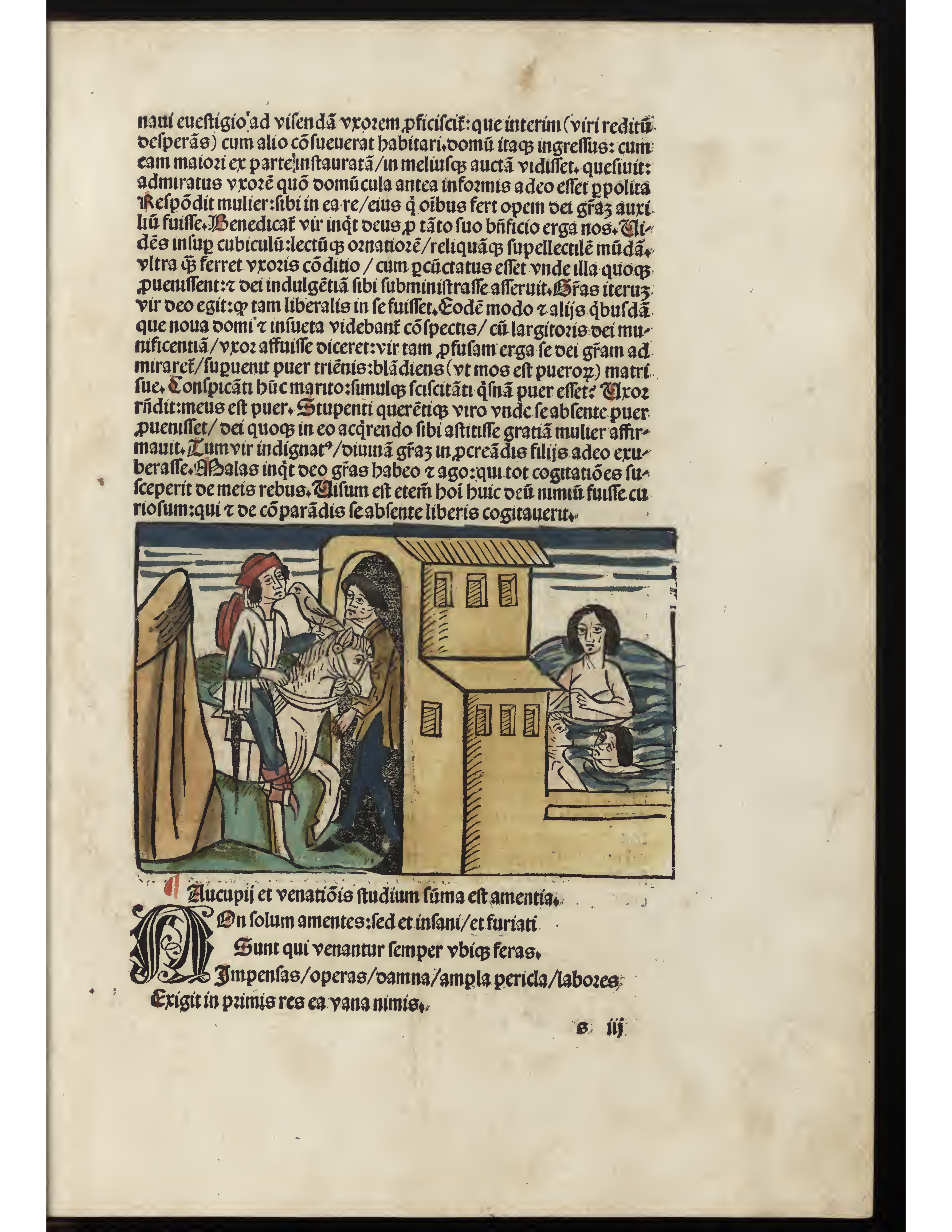 A man standing in the door of a house talks to another man with a sword on his belt who is riding a horse with a bird on its head. Behind the house there is water with 3 women swimming.