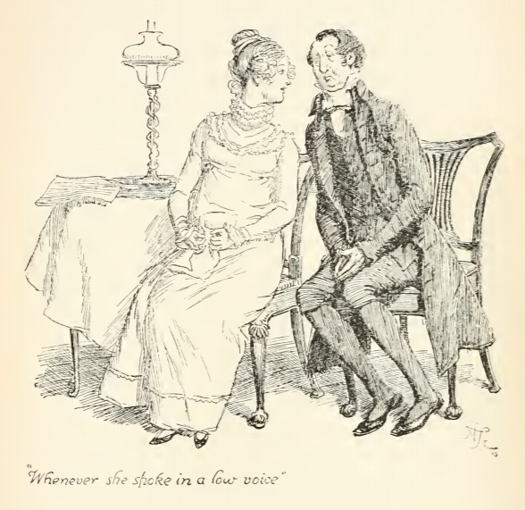 In this image Charlotte Lucas speaks to Mr. Collins. Mrs. Bennet was very angry with Elizabeth, Mr. Collins and Charlotte. Whenever Mrs. Bennet saw Charlotte and Mr. Collins speaking quietly together she was convinced that they were talking about Longbourn and their future there after they inherited it following Mr. Bennet’s death. This scene occurs in chapter 23. The characters are shown in the traditional regency style. Charlotte wears a regency style dress with an empire waistline. Mr. Collins wears a waistcoat and tailcoat. The regency period dated to the early nineteenth century (1811-1820) when George, Prince of Wales, later George IV (r. 1820-1830), reigned as regent for his mentally ill father, King George III (r. 1760-1820). The regency period is associated with the rise of neoclassicism in art and fashion.