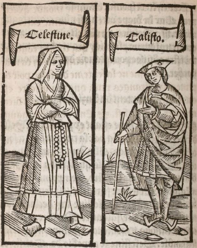 To the left, we see Celestina wearing a robe and a veil, with what appears to be a rosary hanging from her waist. To the right, we see Calisto, who is wearing a hat and holding a long item of some sort, perhaps a cane/walking stick. Both figures are placed outside.The left panel is identical to the panel found on the title page, and on pages 70, 114, 146, and 208 of the text. The right panel is identical to those found on pages 12, 60, 122, and 235, and nearly identical to the one found on page 317 (where it is labeled ‘Centurio’).