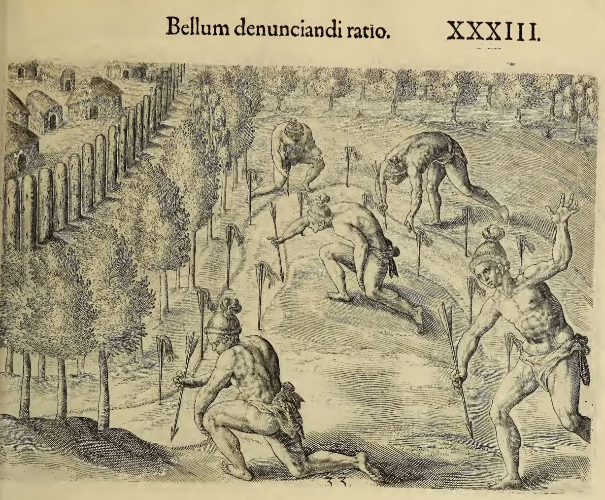 Five Indigenous men are shown. They are in the process of burying arrows, tip down in the ground with the shaft and fletching showing, around the outside of a village.