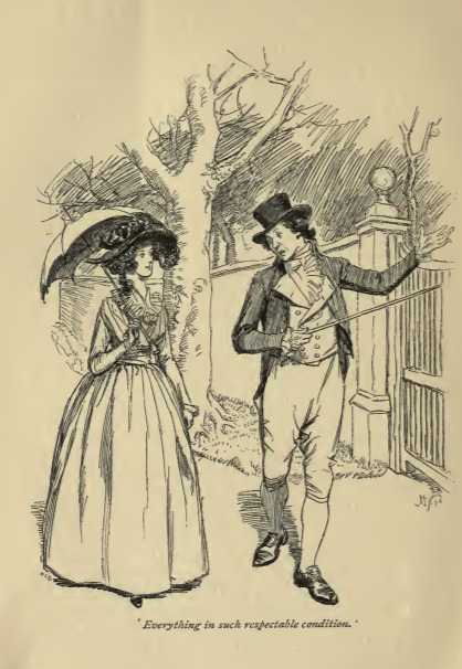 In this image Edward Ferrars and Elinor walk through the grounds of Delaford, Colonel Brandon’s estate. Edward Ferrars began working as the parish priest in Delaford, after Colonel Brandon offered him the post. Edward praises Colonel Brandon and his property, remarking that he would be happy to call Colonel Brandon his brother, implying he wished to see Marianne marry Colonel Brandon. This scene occurs in chapter 50. The characters are shown in the traditional regency style. Elinor wears a regency dress and carries a parasol to protect her from the sun. Edward Ferrars wears a waistcoat and tailcoat, with a top hat. The regency period dated to the early nineteenth century (1811-1820) when George, Prince of Wales, later George IV (r. 1820-1830), reigned as regent for his mentally ill father, King George III (r. 1760-1820). The regency period is associated with the rise of neoclassicism in art and fashion.