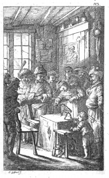 Here Gulliver performs Brobdingnag. Gulliver is the central figure, bowing on a small stage surrounded by giants. The young girl, Glumdalclitch, stands behind the stage, leaning over the back to give Gulliver his directions. There are several other giants watching Gulliver in awe, including a baby who is reaching out to Gulliver in the foreground. The scene takes place in the farmer’s living room, with a portrait of a man above the heads of the giants, and a large window looks out onto mountains. A small dog runs under the bench. The same image appears in the 1761 German edition, however the 1761 German edition is coloured.