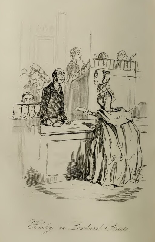 Rebecca Crawley stands at the desk of Messrs. Jones and Robinson’s bank. She is holding out a document which Lord Steyne sent to her, entitling her to a large sum of money. On the other side of the desk is a bank official, holding a coin shovel. In the background are other employees of the bank, seated and standing, carrying quills and books. Below the illustration is printed in cursive its title, Becky in Lombard-Street.
