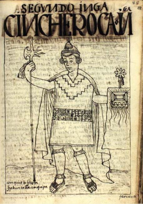 This image depicts the second Inca, Cinche Roca. He is depicted wearing a traditional feathered head visor, a long cloak, and his shirt has three embroidered stripes in the centre. He is holding a mantle in his right hand and a shield in his left. The words conquisto hasta hatun colla ariquipa are written in the bottom left corner of the image, which translates to he conquered up to Hatun Colla, Arequipa. The author mentions that Cinche Roca had killed the first legitimate Inca, Tocay Capac-Pinau, and governed the city of Cusco. The author claims that Cinche Roca died when he was 155 years old.