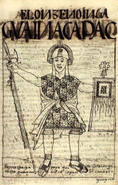 This illustration depicts the eleventh king of the Inca Empire, Huayna Capac Inca. He is depicted wearing an embroidered shirt while holding a shield in his left hand and an ax in his right. There are words written at the bottom of the image that reads Reynó Chachapoya, Quito, Lataconga, Ciccho, Guanca Bilca, Cayanbi, Cañari, which describes the regions of which this king ruled over.