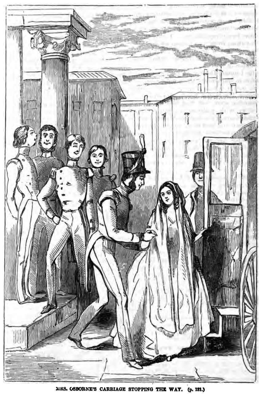 William Dobbin holds Amelia Osborne’s hand as she exits her carriage at the inn after the party. Behind the carriage door, the footman can be seen, and to the left of Dobbin, four young men are talking and smiling on the stair. Below the illustration is printed in cursive its title, MRS. OSBORNE’S CARRIAGE STOPPING THE WAY. (p. 131.).
