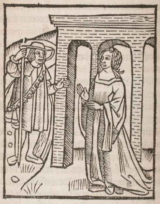 The two figures represented here are Melibea (on the right) and her father Pleberio (on the left). We know this must be the case, since the only other character included in the 20th act is Lucrecia, who only talks with Pleberio in his bedchamber. Thus, we can infer that this illustration depicts the scene in which Pleberio and Melibea are walking outside, after she reveals to him that she has been afflicted by an illness of the heart (but before she reveals to him the cause of this illness).Pleberio is depicted in an odd attire: he is wearing a large hat, a loose-fitting cloak, and a shoulder belt upon which eight bells are hung. In his right hand he is holding what resembles a large walking stick, although the pointed end at the bottom gives it the appearance of a spear. As with all other representations of female characters in this edition, Melibea is depicted wearing a long robe. However, unlike the other female representations, she is not wearing a veil. No part of this image is found anywhere else in this edition.