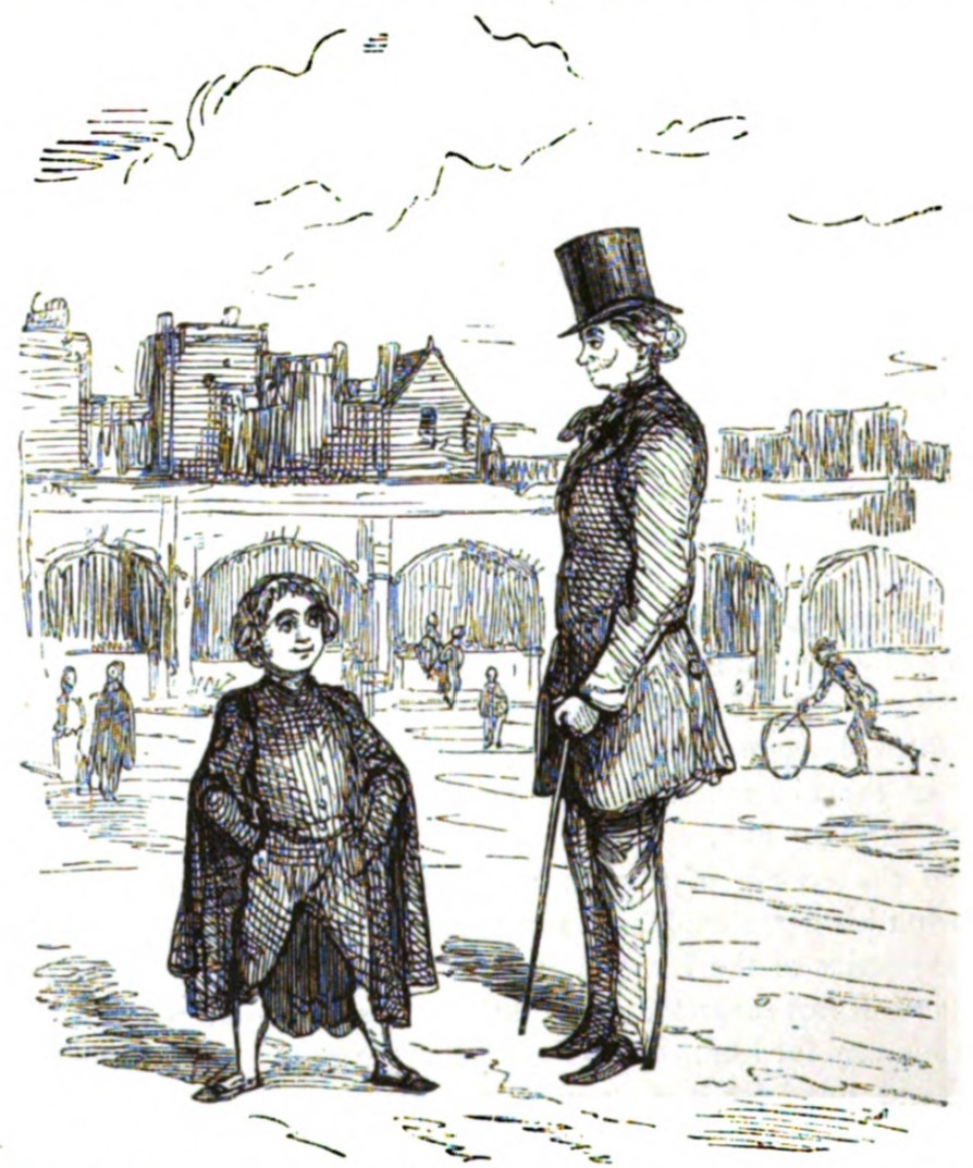 Colonel Rawdon Crawley visits his son, the younger Rawdon Crawley at the Whitefriars, where the boy is attending school. Rawdy is standing tall and proud in his black gown and breeches. In the background are assorted other boys, talking and playing games.
