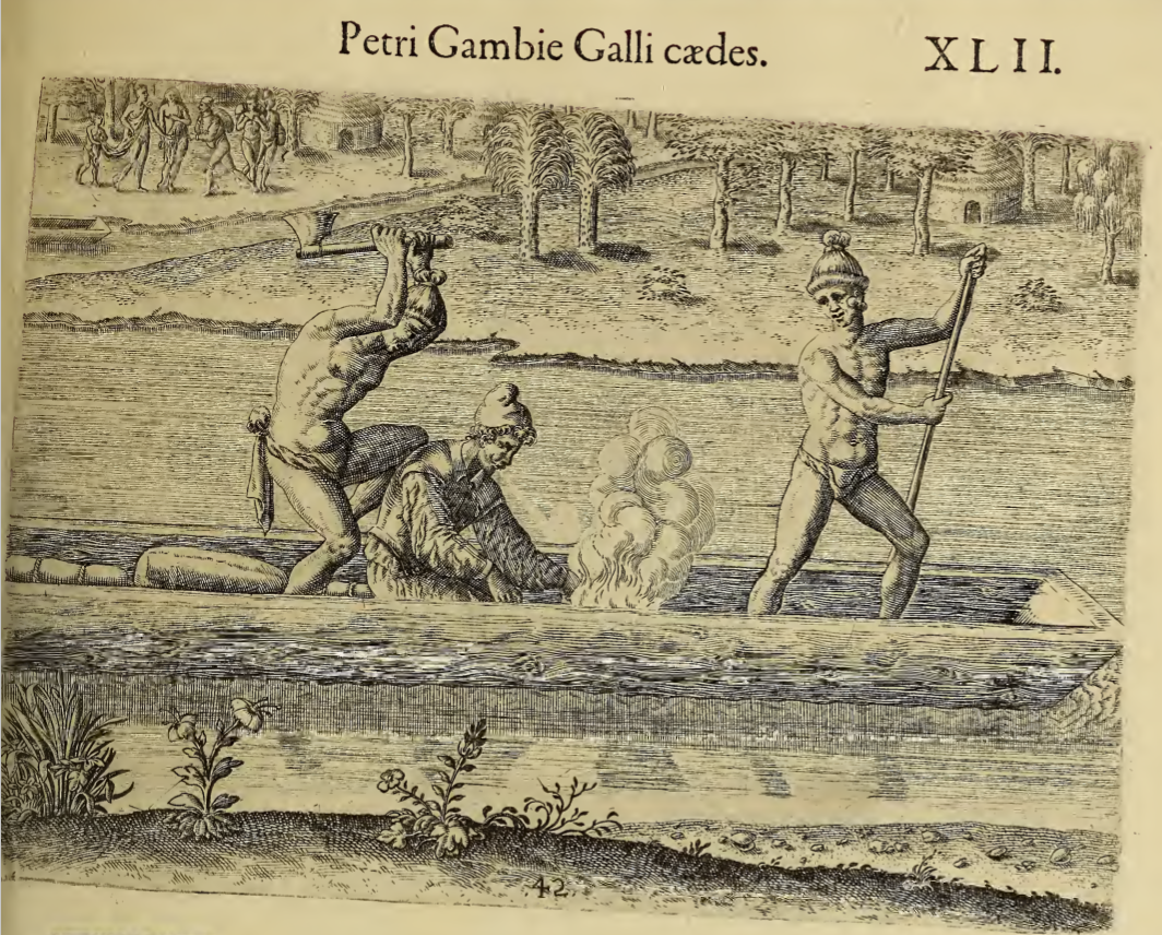 Three men are shown in a dugout canoe. An Indigenous man in the front of the canoe uses a long pole to maneuverer the boat in the river. Another Indigenous man stands in the rear of the canoe, looming over a colonist who kneels in the center of the boat (according to the title, he is a Frenchman named Pierre Gamble). The Indigenous man holds a small axe raised over the colonist’s head. A fire burns in the center of the boat, in front of the colonist.