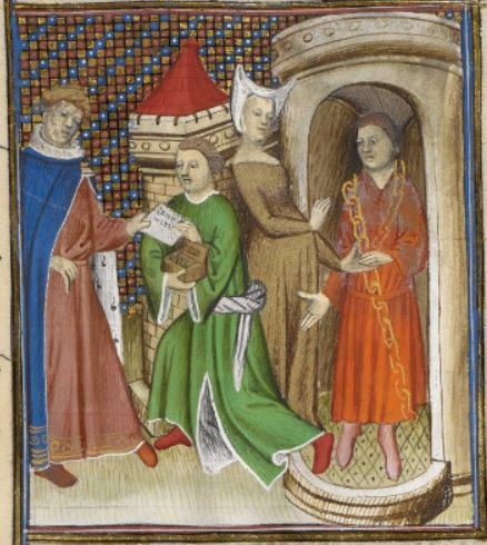 This image depicts Camiola, the daughter of Lawrence of Torringo, paying a ransom to release Roland of Sicily from prison. She felt sympathy for Roland of Sicily who was left to rot in a jail after a battle, so she paid for his ransom in exchange for his hand in marriage. Camiola is depicted wearing a brown dress and a white head piece standing in front of Roland who is chained in a prison cell on the right side of the image. There is a man on the left side of the image delivering the ransom money on behalf of Camiola to the man dressed in green. Roland had agreed to marry Camiola, but when he was freed, he pretended as though he did not agree to marry her. She is famous for having proved herself in front of a judge and spoke out against her husband’s vile behaviour in rejecting her and his promise to her.