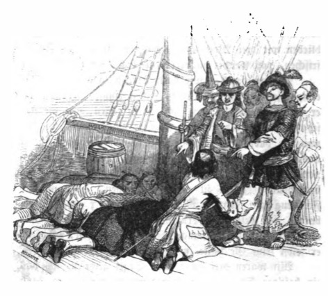 [Gulliver begs the captain of a Dutch pirate ship for mercy]