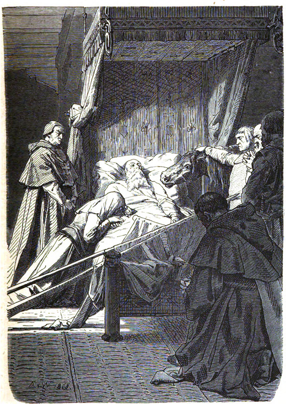 There are seven people in the room and El Cid’s horse Babieca. On the left of the room there is a religious man in his habit with a cross on hanging from his neck. On the floor with her head on the bed is Jimena. Jimena is wearing a dress with a veil to cover her head. On the right side of the image there are four men. The one most visible is kneeling down in prayer wearing his habit. The one next to Babieca is petting him. The one in the bed is El Cid. He is dying. He has a long white beard and he is bald. At the end of his bed there is a flag lying there. The top of the bed has curtains twisted together to prevent them from falling and shielding El Cid from his visitors.