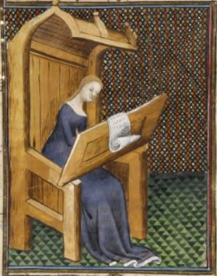 This illuminated image depicts a woman named Erythraea (also known as Eriphila) sitting down while writing a book. Erythraea was a famous sibyl and was known for predicting many major events in history. Boccaccio explains in his story of Erythraea that she predicted the fall of Troy, as well as the life and death of Jesus Christ.