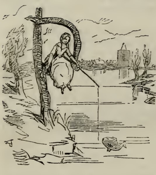 A female figure is seated in a wooden letter P of Poor on the banks of a stream or river. She holds in her left hand a fishing rod, which has attracted the attention of a single large fish. In the background are several trees and the shapes of buildings in a city or town in the distance.