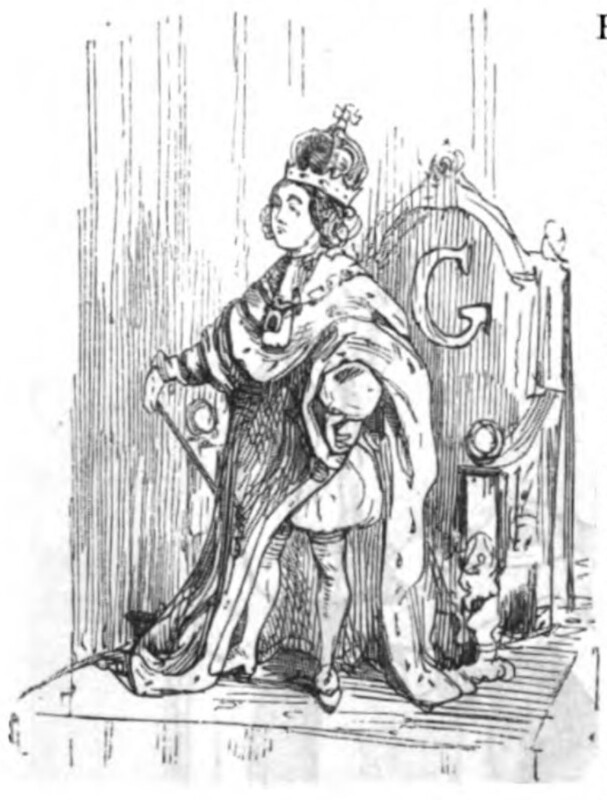 - Georgy Osborne, dressed as a king in a crown and robe, stands in front of a throne engraved with the first letter of his name.
