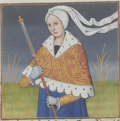 This illumination depicts Lavinia, queen of Laurentum. Lavinia married the famous hero, Aeneas of Troy, after her father heard from an oracle that she should marry a foreign man. Boccaccio explains that Aeneas died shortly after Lavinia gave birth to their first child, Postumus.