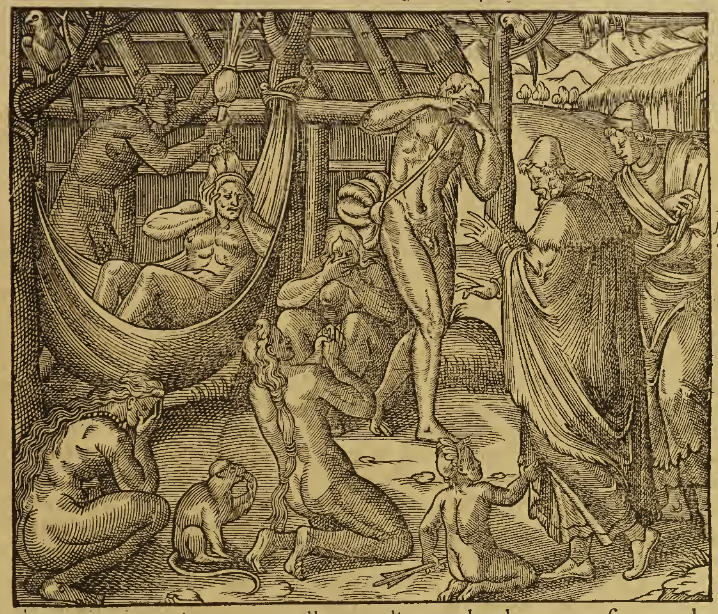 A group of Indigenous men, women, and children cry of happiness, some with their hands over their faces or clasped in front of them in displays of emotion. One man sits in a hammock, while two others stand around him, and three women and a child crouch or kneel on the ground. Two European men stand beside the group, dressed in long robes with caps on their heads. The child sits on the ground near the feet of one of the men and pulls on the bottom of his robes with one hand. Two structures are visible, one directly behind the group and another in the distance. This image is identical to one found on page 929 of Paris, 1575 (Chaudière).